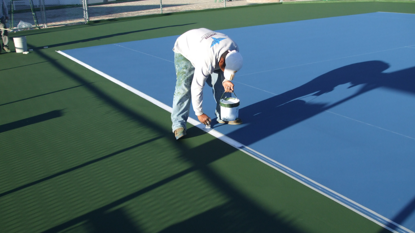 Construcción y mantenimiento de canchas de tenis con base y colores acrílicos ideal para juego profesional.